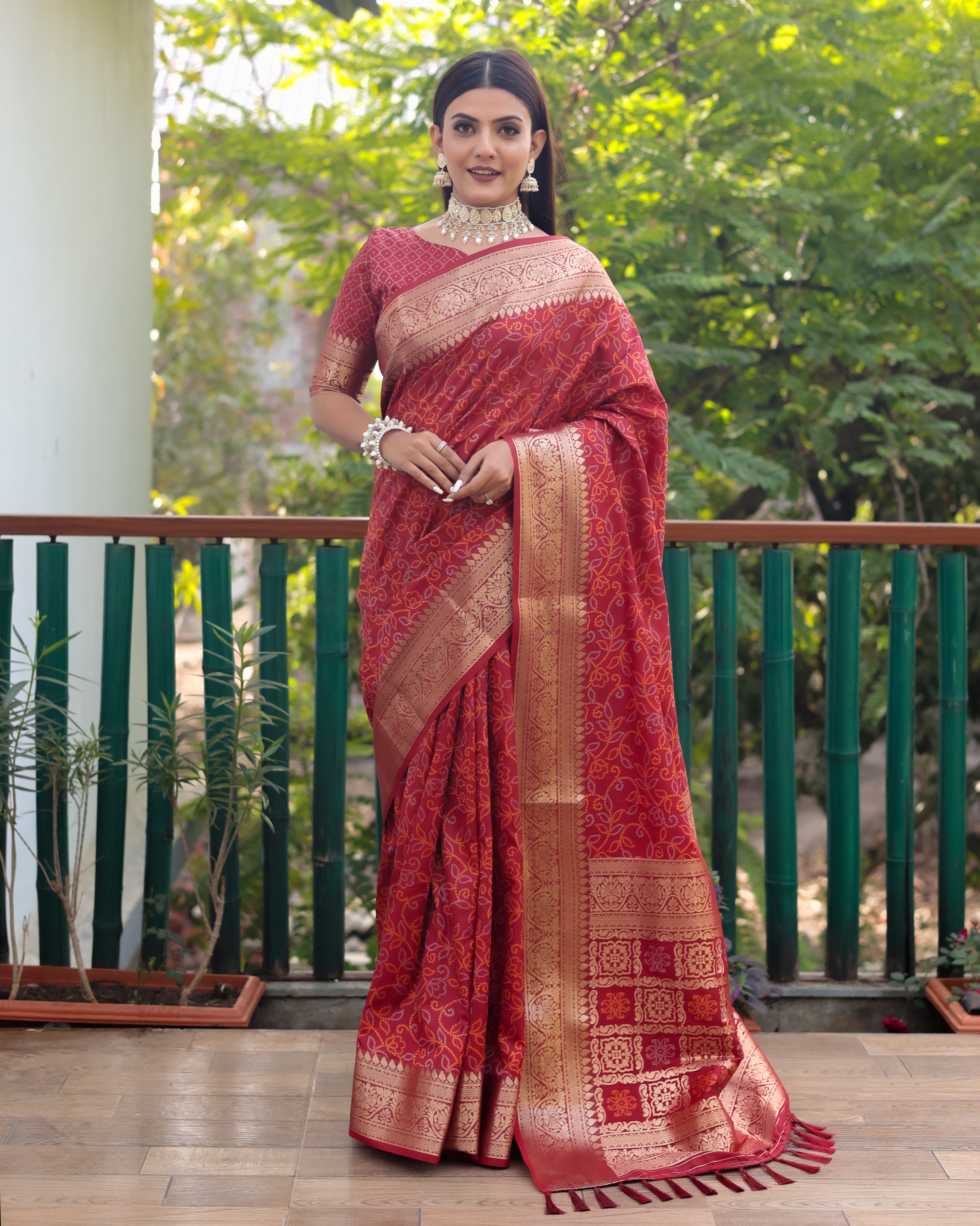 Brick Red Color kanchi Border Rich Pallu Bandhej Saree