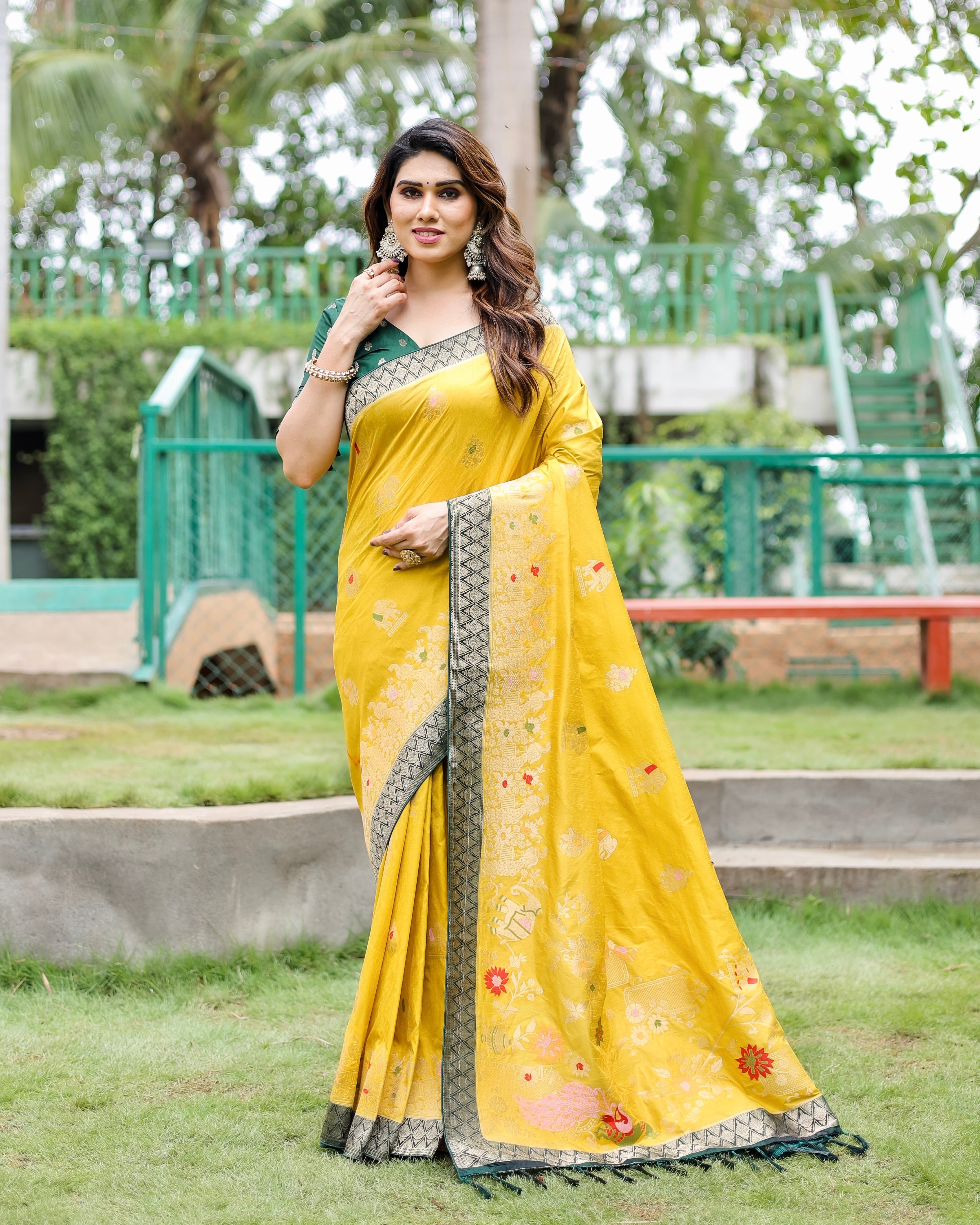 Premium Quality Handpicked & Easy To Drape Dola Silk Yellow Saree For This Wedding Season