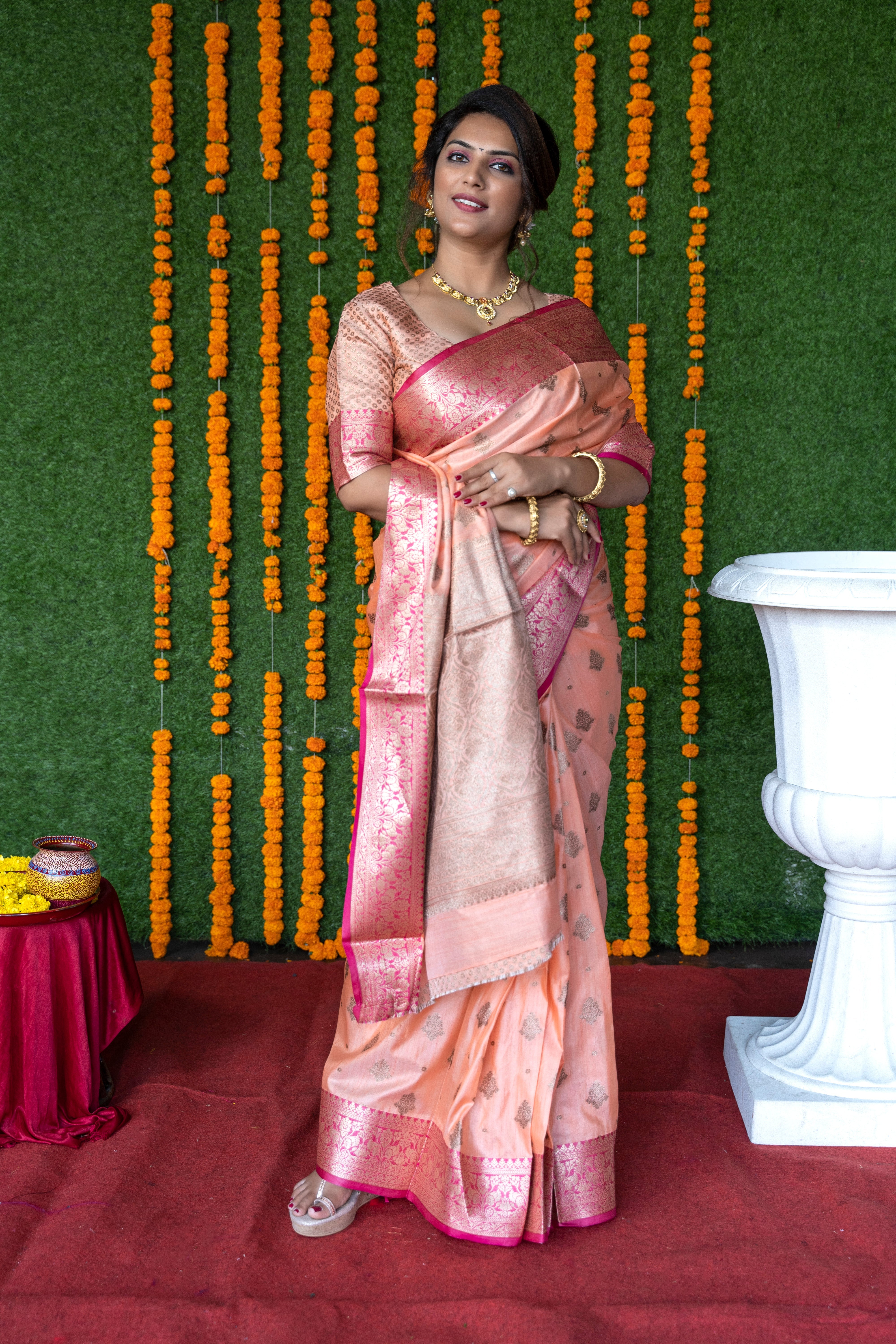It is paired with a silk banarasi saree in peach color highlighted with weaved zari work.