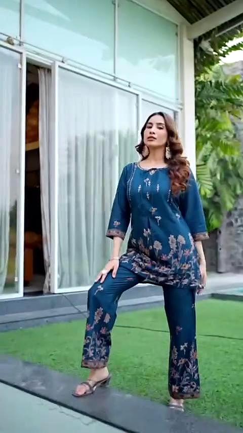 The top, detailed with intricate handwork And printed Top, whispers elegance with every thread. Featuring a classic Mandarin collar and soft 3/4 sleeves, it drapes in a relaxed fit that feels as effortless as it looks.